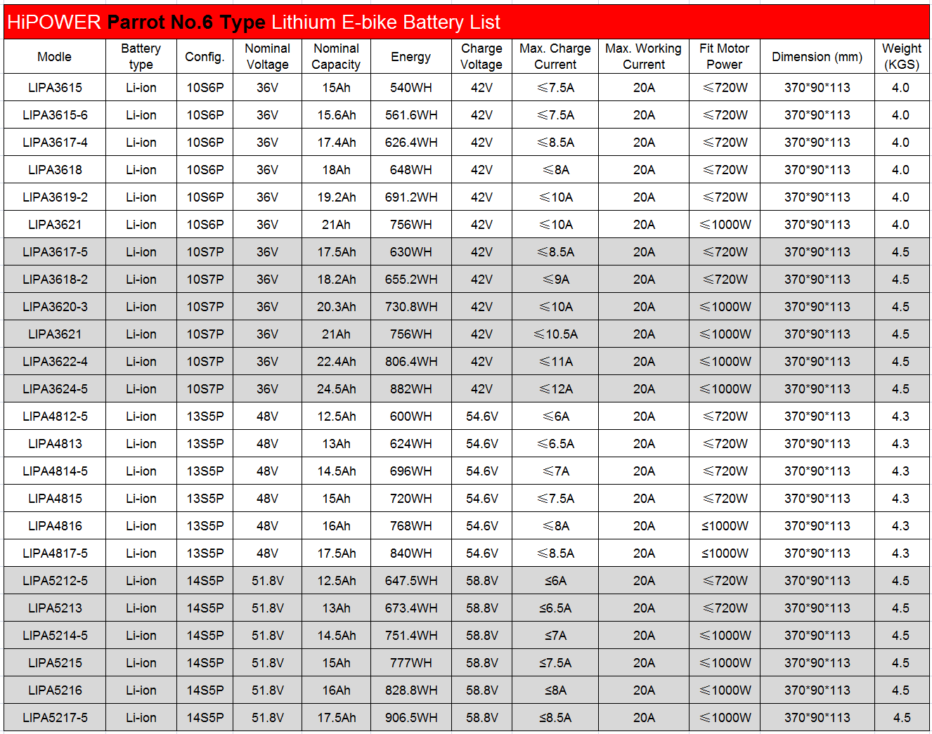 HiPOWER Parrot No.6 Type Lithium E-Bike Battery 36V 15Ah